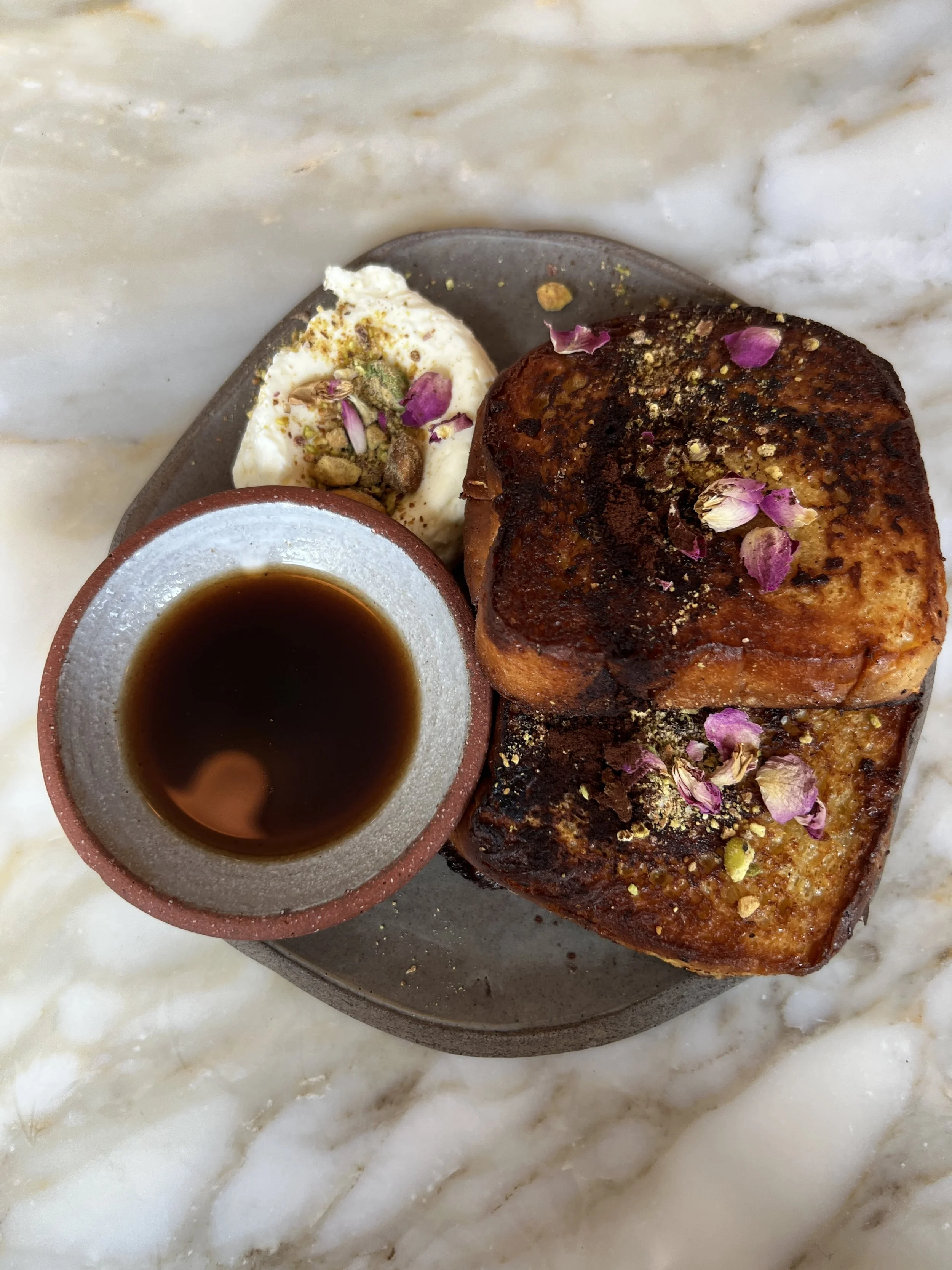 The Arabic Coffee French Toast - this was a showstopper — pillowy brioche soaked in warming spices, topped with sweet whipped laban, cocoa and pistachio. A total dream.