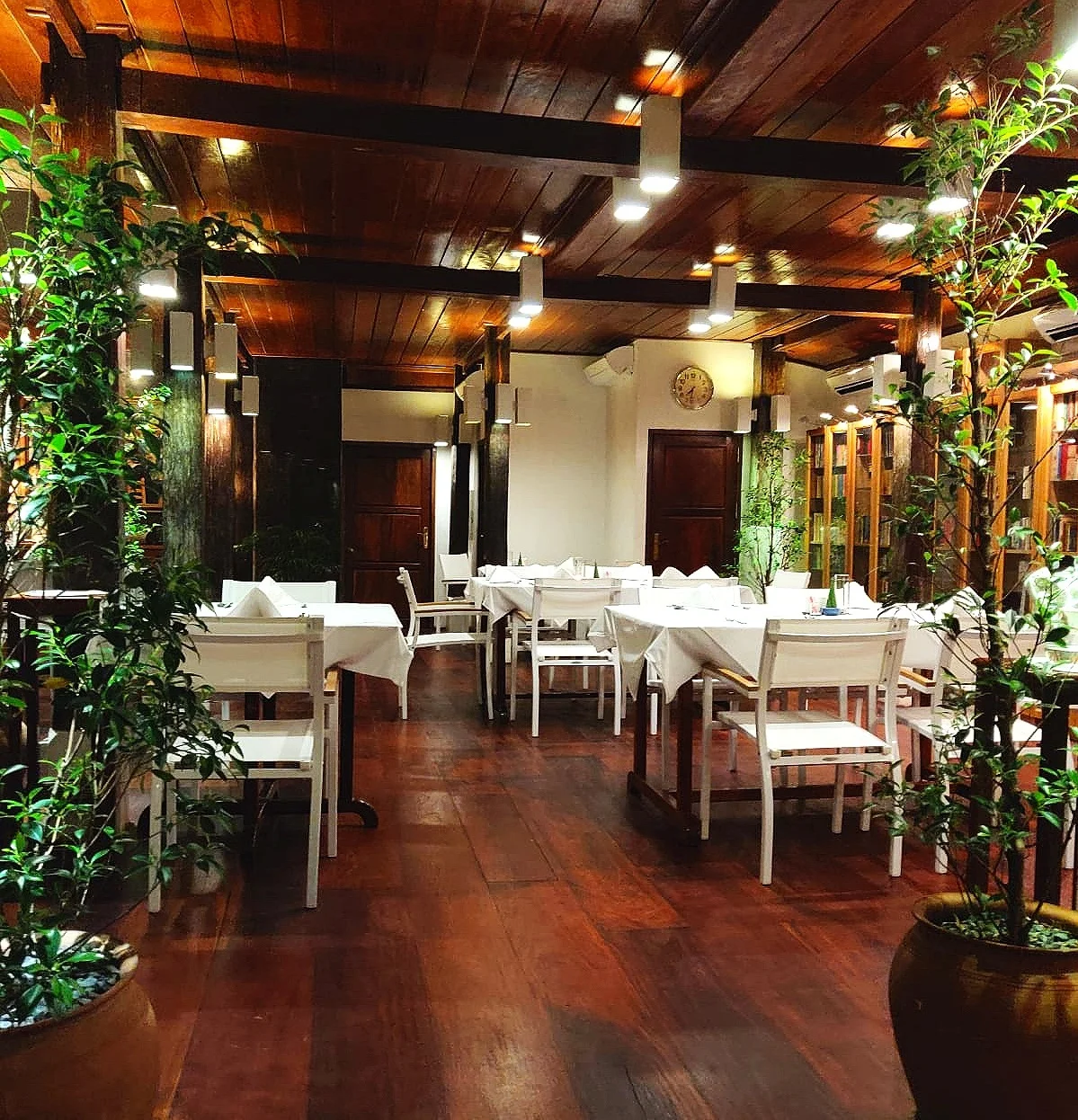 Blue Lagoon has beautiful dark wood flooring and elegant white dining tables